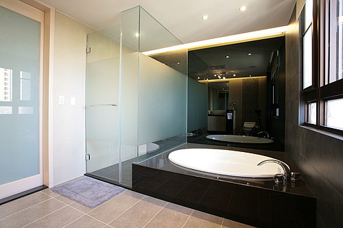 四、質感差異:「黑鏡」的玻璃經過染色,比較有沈穩豪華的質感 v.s.「黑色烤漆玻璃」則可以選擇含有亮粉的漆來作質感變化。